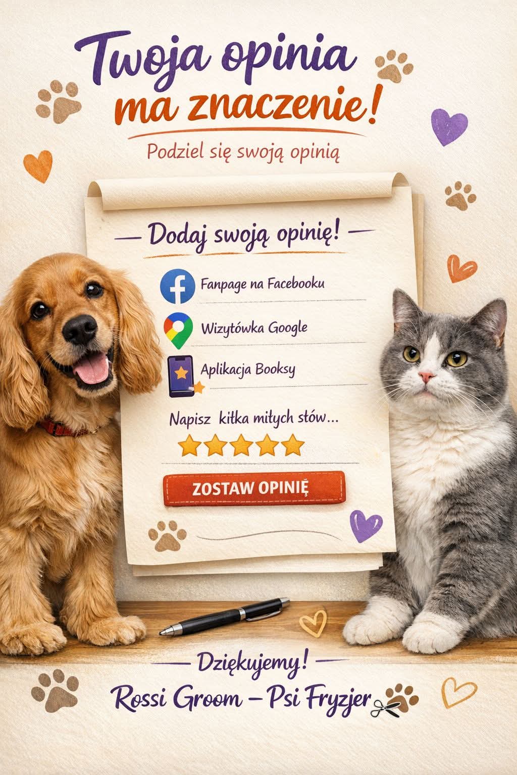 Każda wizyta w moim salonie to nie tylko strzyżenie czy pielęgnacja, ale przede wszystkim troska o komfort i dobre samopoczucie Twojego pupila. Jeśli po wizycie masz poczucie, że Twój zwierzak był w dobrych rękach, będzie mi ogromnie miło, jeśli podzielisz się tym w krótkiej opinii.